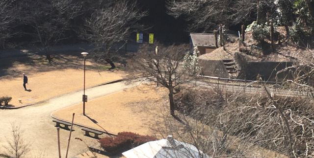 下の日から5日目 またも週末を迎えようとしている 斜面の梅が開花 芝生では園児の集団がハシャギ廻っていた
