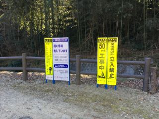 扇町側の入口に8は注意のタテカン 降りてみると源長川の柵の改修