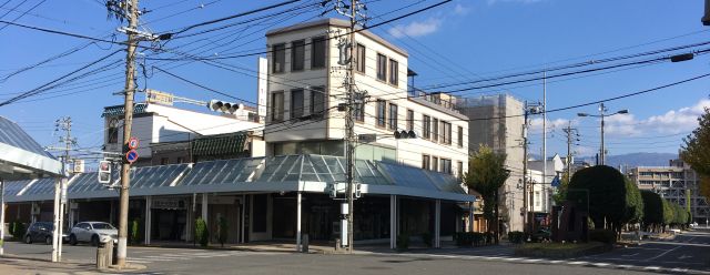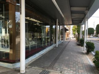 店舗のガラスサッシ部分が 2軒北側の飯田ツーリストの事務所の外壁と ほぼ面一で