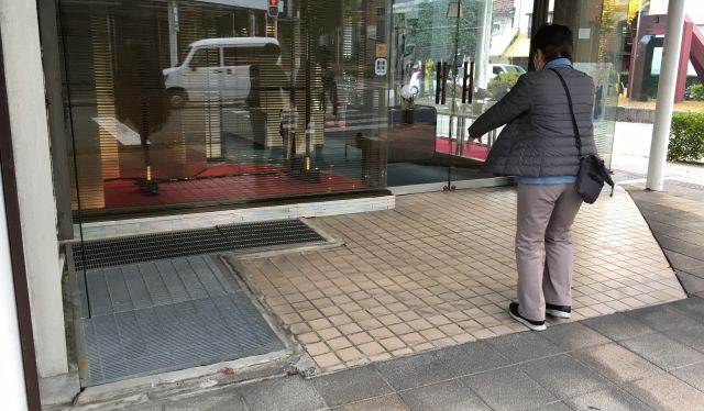 銀座4丁目 文具のキング堂と隣接の柴田薬局では傾斜路を共有しての